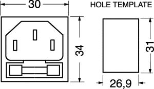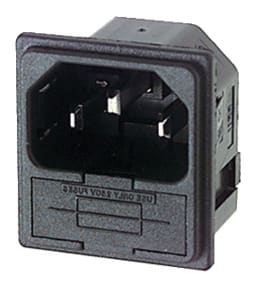 SPINA TRIPOLARE C14 CON PORTA FUSIBILE 5x20. FISSAGGIO:autobloccante. PORTATA:10 A - 250 V. CORPO:bachelite. CONTATTI:ottone. FISSAGGIO CAVO:faston da 4,8mm con foro. PER PRESE:13/845. CAVI:6/300. MAX SPES. PANN.:1,5 mm.