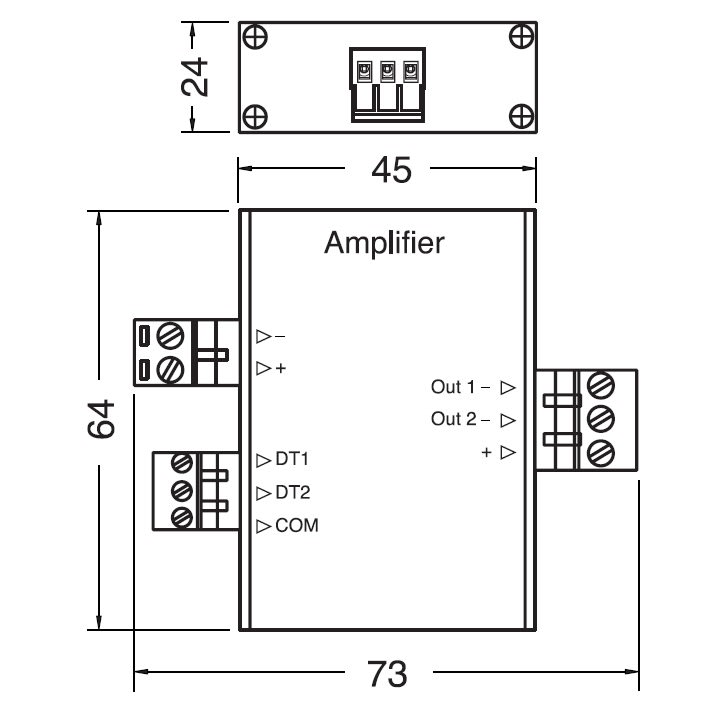 Adatto per l’amplificazione segnale del controller 13/22045-00 con il quale è possibile gestire la regolazione dell’ intensità luminosa e temperatura colore della strscia led 19/91200-00 e 19/91250-00. PORTATA MAX: 5A per canale. TENS. INGRESSO: 12-24 VCC. TENS. USCITA: 12-24 VCC. Tensione di ingresso è uguale alla tensione di uscita. DIMENSIONI: 73x64x24 mm. TEMPERATURA DI LAVORO: -10°C ÷ +50°C.