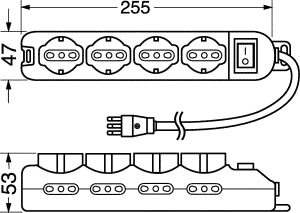 Presa multipla a 12 posti con interruttore. Dotata di interruttore luminoso. Con terra; base e coperchio in materiale termoplastico antiurto. Prese con alveoli di sicurezza schermati. Con possibilità di fissaggio. • Portata: 16A - 250V • Potenza max: 2500W