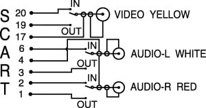 CAVO AUDIO/VIDEO SCART 21 POLI / RCA. CONNETTORI:1 SPINA SCART 21 POLI. 1 SPINA RCA VIDEO. 2 SPINE RCA AUDIO. COMMUTATORE:IN/OUT. FINITURA:NICHELATA. COLORE GUAINA:NERO.