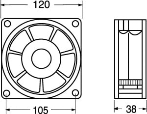 VENTILATORE ASSIALE SUPPORTO BRONZINE 120x120x38 mm. ELICA:poliestere termopl. TEMP. LAV.:-10°C÷+70°C. FATT. RUMORE:42 dB. GIRI MIN./RPM:3000. CFM:105. GRIGLIA:45/9655. Tensione: 24V.