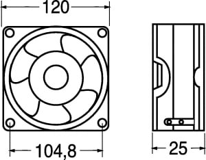 VENTILATORE ASSIALE SUPPORTO BRONZINE 120x120x25.4 mm. ELICA:poliestere termopl. TEMP. LAV.:-10°C÷+70°C. FATT. RUMORE:42 dB. GIRI MIN./RPM:2350. CFM:80. GRIGLIA:45/9655. Per applicazioni varie. Tensione: 110V.