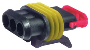 CONNETTORI PORTAFEMMINE AMP SERIE SUPER SEAL 1.5. Intercambiabili e interconnettibili con gli attuali componenti e con gli apparecchi già in uso nel settore automobilistico (sensori, controllo temperatura acqua, ecc.). Resistenti all'immersione statica edinamica in accordo alla norme IEC 529 e DIN 40050 I.P. 6.7. Resistenti a ozono,idrocarburi aromatici, sali, liquido freni, liquido anticongelante ecc. BLOCCH.:poliammide 6,6. caricato vetro approvato UL. AGGANCIO SECONDARIO:poliammide 6,6 caricato vetro approvato UL. GUARN.:gomma siliconica. TEMP.:-40°C÷+125°C. RESIST. ISOL.:200 MOHM. CONTATTI:serie 98/16308. CONNETTORI:98/15995. ESTRATTORE:98/46408. TAPPO CAVITA’:98/16341. CAPPUCCI:serie 98/16245. N.Poli: 5.