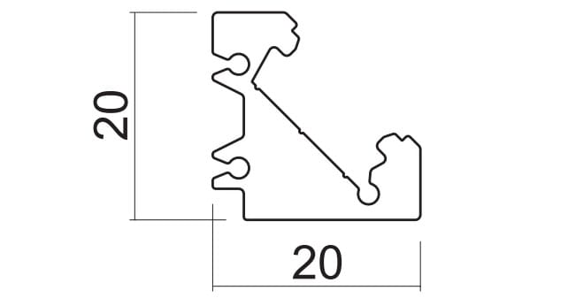 Profilo in alluminio anodizzato ANGOLARE (fascio luce 45°) per PROLINE 2020. Profilo in alluminio completo di testate di chiusura. Dimensione: 200mm. Finitura: Alluminio anodizzato. Dimensione: 20x20x1000mm.