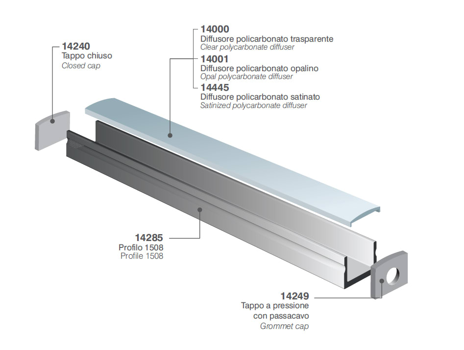 Profilo in estruso di alluminio per l'installazione a plafone per Proline 1508. IP20. Classe III. Finitura nero. Dimensione: 2000x15x8mm.