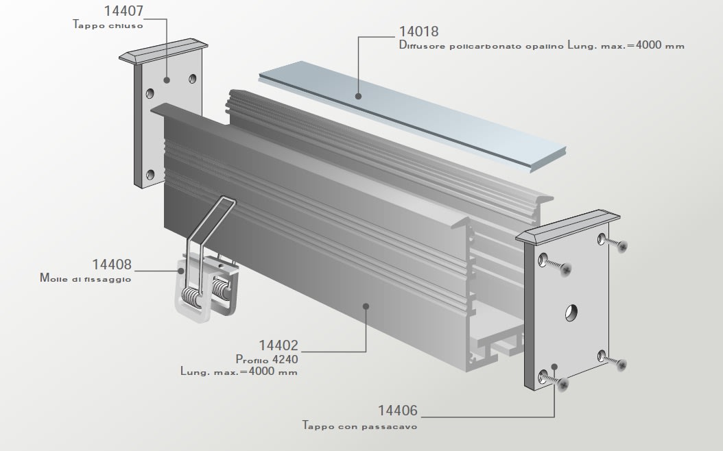 PROLINE 4240. Caratteristiche: Profilo in alluminio anodizzato. Diffusore in policarbonato trasparente o opalino resistente ai raggi UV. Profilo in alluminio completo di tappi di chiusura e molle da incasso. Finitura: bianco. L: 3000mm.
