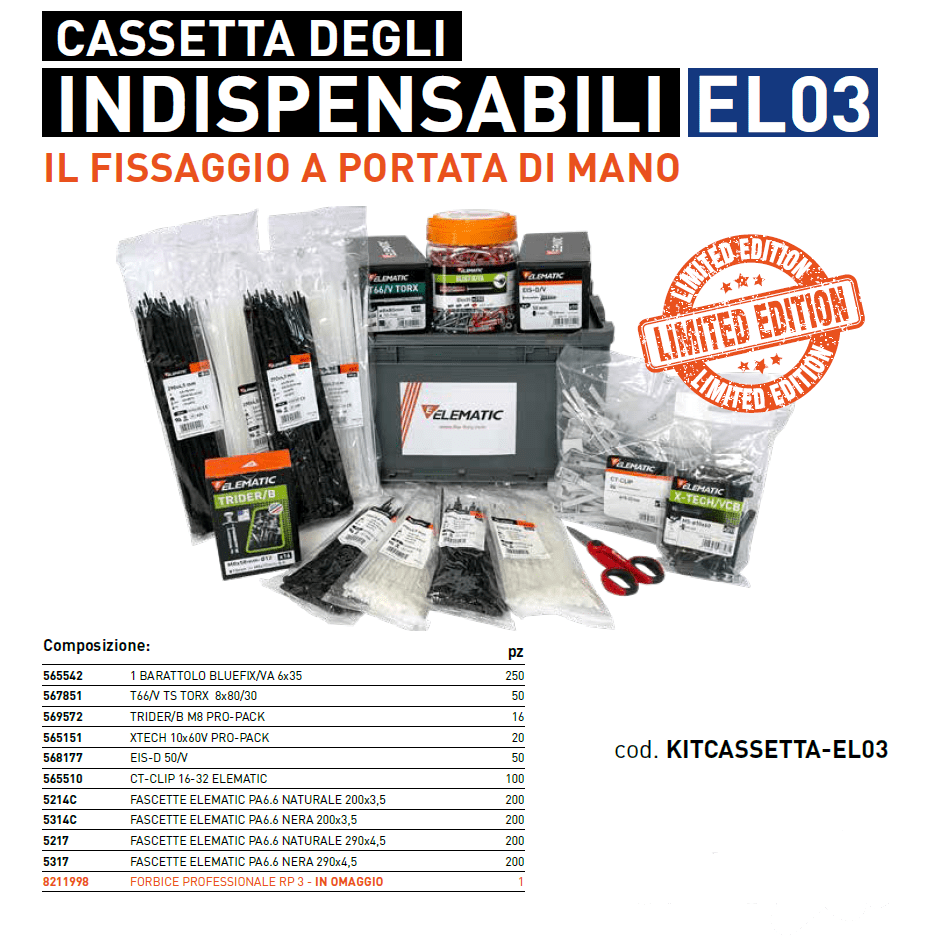 La cassetta degli indispensabili EL03 e un mix di prodotti per il fissaggio Elematic Spit pensati esclusivamente per l'elettricista. All'interno troverai: 565542 1 BARATTOLO BLUEFIX/VA 6x35 (250 pz) 567851 T66/V TS TORX 8x80/30 (50 pz) 569572 TRIDER/B M8 PRO-PACK (16 pz) 565151 XTECH 10x60V PRO-PACK (20 pz) 568177 EIS-D 50/V (50 pz) 565510 CT-CLIP 16-32 ELEMATIC (100 pz) 5214C FASCETTE ELEMATIC PA6.6 NATURALE 200x3,5 (200 pz) 5314C FASCETTE ELEMATIC PA6.6 NERA 200x3,5 (200 pz) 5217 FASCETTE ELEMATIC PA6.6 NATURALE 290x4,5 (200 pz) 5317 FASCETTE ELEMATIC PA6.6 NERA 290x4,5 (200 pz) 8211998 FORBICE PROFESSIONALE RP 3 - IN OMAGGIO (1 pz)