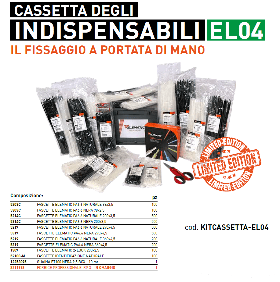 La cassetta degli indispensabili EL04 e un mix di prodotti Elematic Spit pensati esclusivamente per l'elettricista. All'interno troverai: 5203C FASCETTE ELEMATIC PA6.6 NATURALE 98x2,5 (100 pz) 5303C FASCETTE ELEMATIC PA6.6 NERA 98x2,5 (100 pz) 5214CFASCETTE ELEMATIC PA6.6 NATURALE 200x3,5 (500 pz) 5314C FASCETTE ELEMATIC PA6.6 NERA 200x3,5 (500 pz) 5217 FASCETTE ELEMATIC PA6.6 NATURALE 290x4,5 (500 pz) 5317 FASCETTE ELEMATIC PA6.6 NERA 290x4,5 (500 pz) 5219 FASCETTE ELEMATIC PA6.6 NATURALE 360x4,5 (200 pz) 5319 FASCETTE ELEMATIC PA6.6 NERA 360x4,5 (200 pz) 1307 FASCETTE ELEMATIC 2-LOCK 200x2,5 (100 pz) 52100-M FASCETTE IDENTIFICAZIONE NATURALE (100 pz) 12253095 GUAINA ET100 NERA 9,5 BOX - 10 mt (1 pz) 8211998 FORBICE PROFESSIONALE RP 3 - IN OMAGGIO (1 pz)