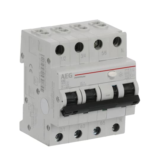 Interruttore automatico differenziale magnetotermico serie DMA63NP; 3P+N; corrente nominale 10...32A; potere di cortocircuito nominale Icn secondo EN 61009-1 6000A; capacità di rottura secondo EN 60947-2 a 230VAC 10kA; tensione nominale Un 415VAC; tensione d'impiego min-max 300-440VAC; classe A; soglia d'intervento 300mA; curva caratteristica C