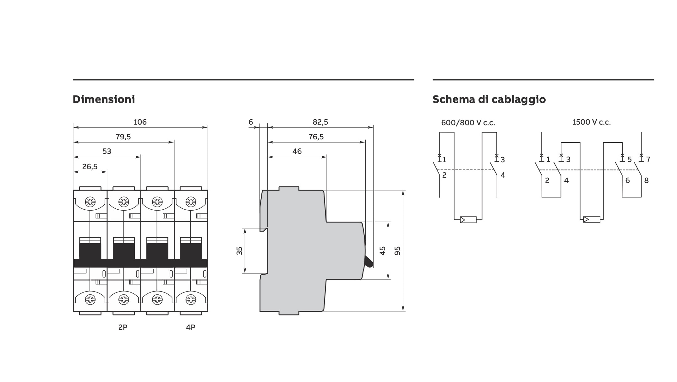 Interruttore automatico AEG serie ElfaNEXT, modello E880SUC 4 poli, 6 moduli, curva B, corrente nominale da 16A a 125A, tensione nominale 1500VDC, tensione di tenuta ad impulso 8kV, temperatura di funzionamento -25/60°C, temperatura di stoccaggio -40/70°C, grado di protezione IP20, capacità dei terminali 0...50mm2 flessibile, 0...70mm2 rigido, posizione di montaggio qualsiasi.
