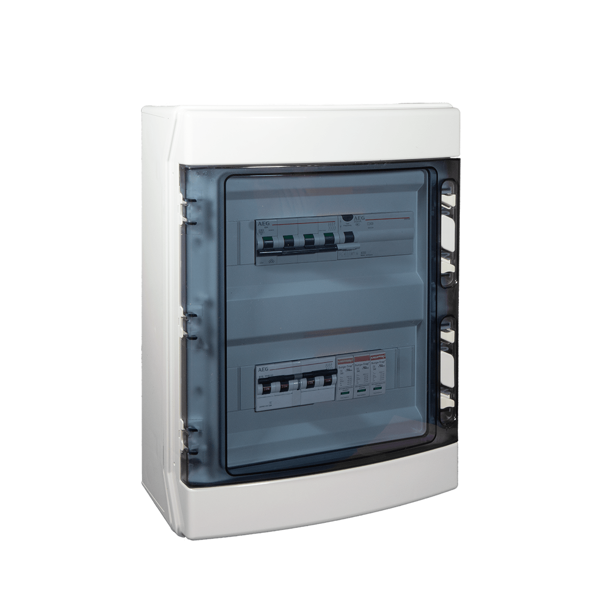 Quadro cablato AC trifase per la protezione dell' inverter e del contatore di produzione. Composto da un interruttore magnetotermico differenziale protezione inverter in curva C 6kA classe A da 300mA, un interruttore magnetotermico 6kA protezione rete e uno scaricatore di sovratensione di Tipo 2. La componentistica è inserita all'interno di un centralino in materiale isolante IP65 a 24 moduli.