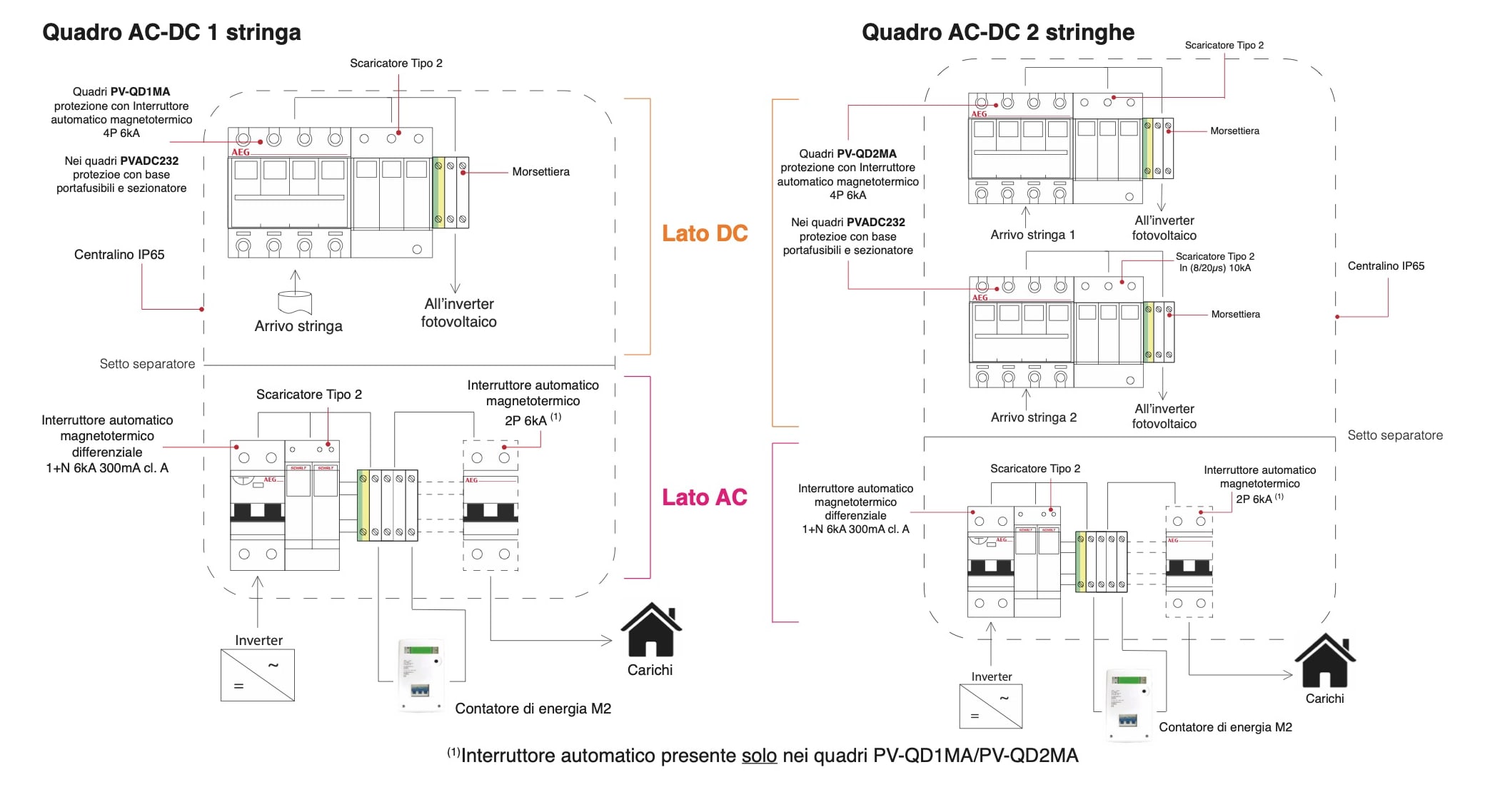 Quadro cablato AC/DC monofase per 2 stringhe dotato di componenti per la protezione completa dell'impianto fotovoltaico e contatore, dalla generazione alla distribuzione. Il quadro è composto da 1 interruttore magnetotermico differenziale 300mA 6kA curvaC, 1 scaricatore di Tipo 2 da 10kA, 1 interruttore magnetotermico 2P curva C, 1 interruttore magneotermico DC e 1 scaricatore Tipo 2 da 20kA. Tutta la componentistica è racchiusa all'interno di un contenitore in materiale plastico IP65-IK08 da 24 moduli DIN.