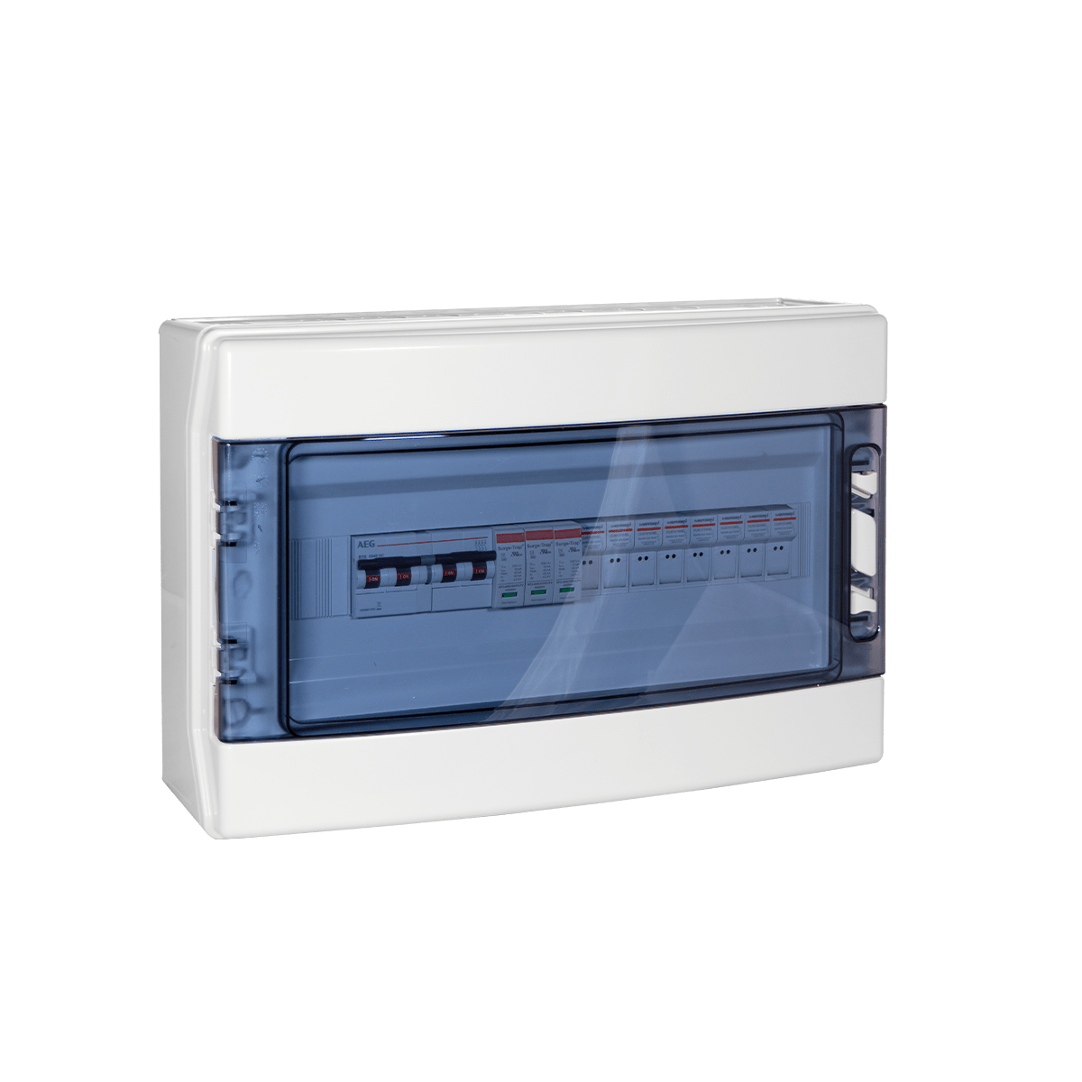 Quadro cablato di protezione stringa per impianto fotovoltaico. 4 stringhe parallele fino a 880Vdc con protezione tramite interruttore automatico in ingresso, scaricatore di sovratensione tipo 2 a 3 cartucce 1000Vdc Isn 20kA, 4 basi portafusibili e contenitore in ABS con porta trasparente 18 moduli IP65. Interruttore: AEG E94SUCB63 curva B 63A