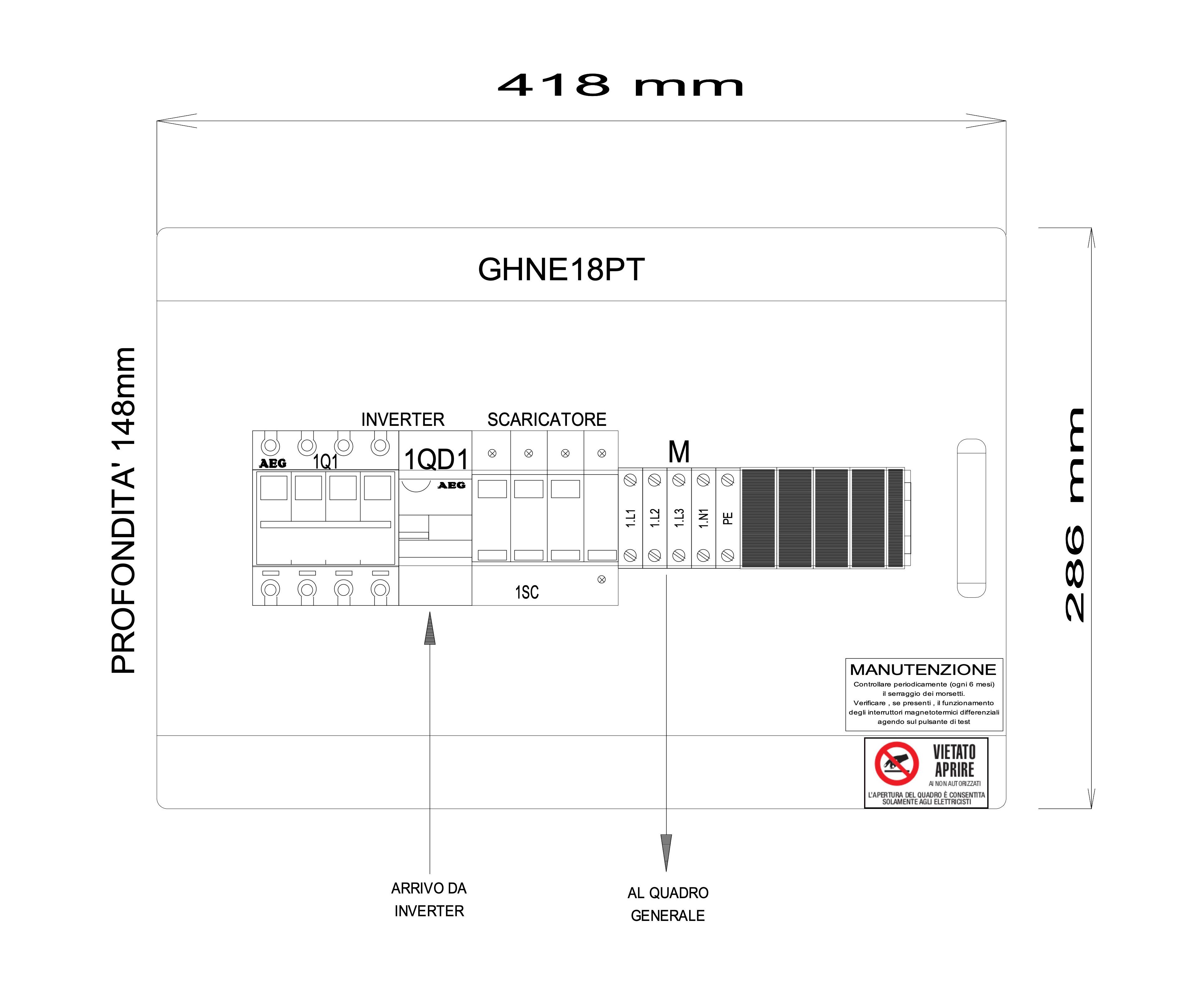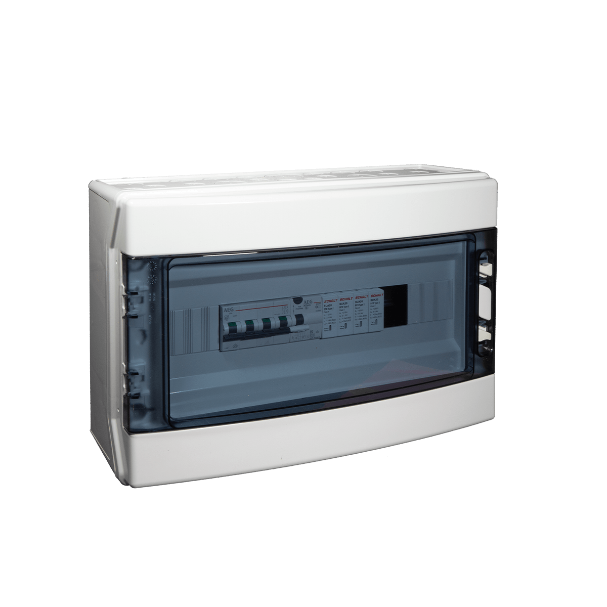 Quadro cablato AC trifase per installazione tra inverter e quadro di alimentazione. Composto da un interruttore magnetotermico differenziale in curva C da 6kA classe A da 300mA e da uno scaricatore di sovratensione di Tipo 2. La componentistica è inserita all'interno di un centralino in materiale isolante IP65 a 18 moduli.