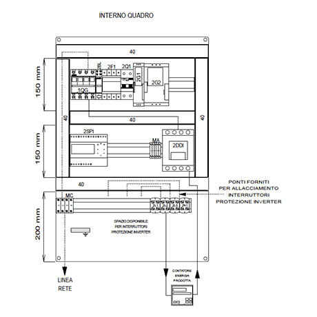 I quadri di interfaccia OPEN rappresentano una soluzione per la connessione di impianti fotovoltaici CEI 0-21. I quadri OPEN nascono con lo spazio e la predisposizione di cablaggio per gli interruttori di protezione inverter che saranno installabili successivamente tramite i collegamenti già forniti a corredo-Interruttore Generale 4x63A 15kA (EN60947-2) con bobina di sgancio per funzione di rincalzo-Relè di interfaccia NA003 con Ups di emergenza come da norma CEI 0-21-Contattore DDI 4 poli 37kW AC-3. Spazio per cablaggio Interruttori protezione inverter 3F+N:1x33kW, 2x15kW (opppure 20kW+10kW), 3x10kW-Kit di cablaggio incluso nella confezione (3x25mm2 nero+1x25mm2 blu; 6x16mm2 nero+2x16mm2 blu) - Interruttori previsti 3F+N (da ordinare a parte): 10kW DMA63NPC20/300; 12,5kW DMA63NPC25/300; 15kW DMA63NPC32/300; 20kW E94SC40+HD9532/300; 25kW E94SC50+HD9463/300; 33kW E94SC63+HD9463/300. Tutti i componenti sono racchiusi all'interno di un contenitore a parete in ABS IP54 LxHxP 700x500x250mm.