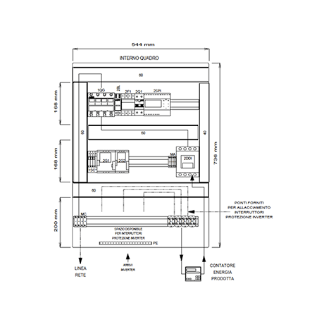 I quadri di interfaccia OPEN rappresentano una soluzione per la connessione di impianti fotovoltaici CEI 0-21. I quadri OPEN nascono con lo spazio e la predisposizione di cablaggio per gli interruttori di protezione inverter che saranno installabili successivamente tramite i collegamenti già forniti. - Interruttore Generale 4x80A 50kA (EN60947-2) con bobina di sgancio per funzione di rincalzo - Relè di interfaccia NA003 con Ups di emergenza (CEI 0-21) - Contattore DDI 4 poli 80A AC-3. Spazio per cablaggio Interruttori protezione inverter 3F+N: 1x40kW, 2x20kW (oppure 30kW+10kW), 3x12,5kW - Kit di cablaggio incluso nella confezione (3x25mm2 nero+1x25mm2 blu; 6x16mm2 nero+2x16mm2 blu)-Interruttori previsti 3F+N (da ordinare a parte):10kW DMA63NPC20/300; 12,5kW DMA63NPC25/300; 15kW DMA63NPC32/300; 20kW E94SC40+HD9532/300; 25kW E94SC50+HD9463/300; 33kW E94SC63+HD9463/300; 40kW E880504C80+HD94100/300. I componenti sono racchiusi in un contenitore a parete in ABS IP54 LxHxP 800x600x260mm.