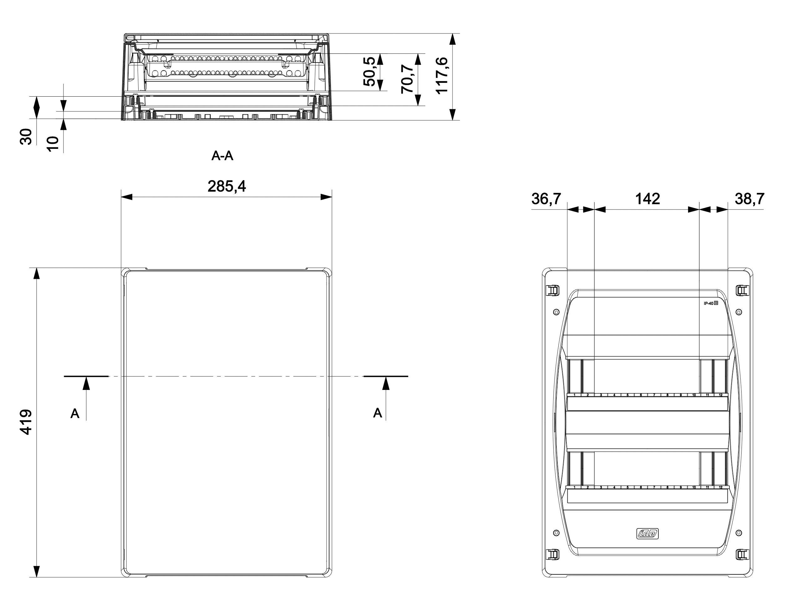 CENTRALINO DA PARETE SCHALT IP40 1 FILA 12 MODULI, PORTA CIECA, TENSIONE NOMINALE DI IMPIEGO 1000VAC/1500VDC, CLASSE DI ISOLAMENTO II, RESISTENZA AGLI URTI IK08, RESISTENZA AL CALORE CON PROVA DEL FILO INCANDESCENTE FINO A 650? C, STRUTTURA IN ABS PRIVA DI ALOGENI, COLORE BIANCO RAL9003, TEMPERATURA DI FUNZIONAMENTO -25/+40?C, MASSIMA POTENZA DISSIPABILE 28.3W, NORMA EN62208