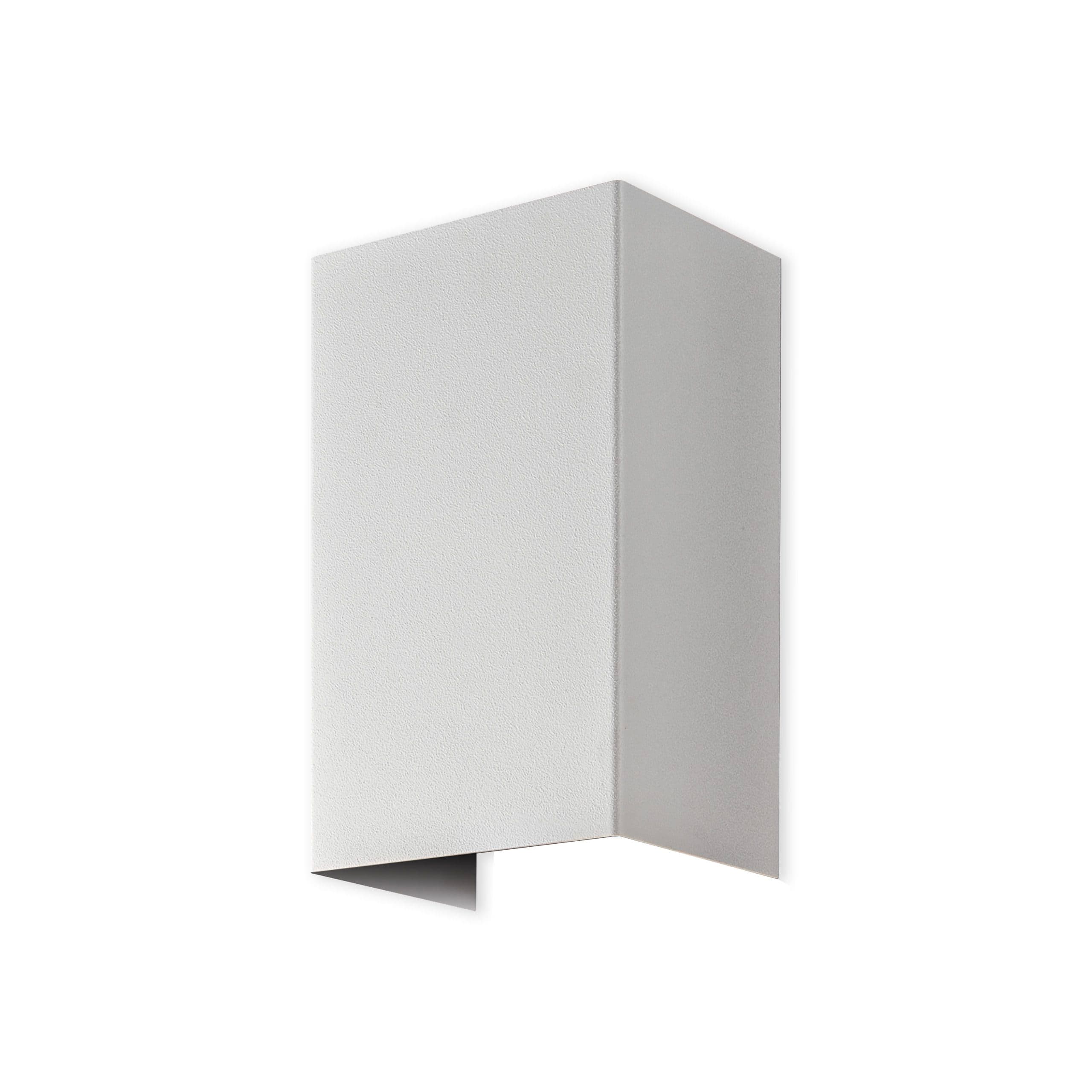 Apparecchio a parete a biemissione con sorgente LED chip on board (COB) alimentata a corrente costante attraverso driver integrato nel corpo dell?apparecchio. Corpo in alluminio pressofuso lega 6060. Carter esterno decorativo in lamiera piegata verniciata a liquido. La finitura bianco intonaco e verniciabile. Disponibile kit antiabbagliamento.
