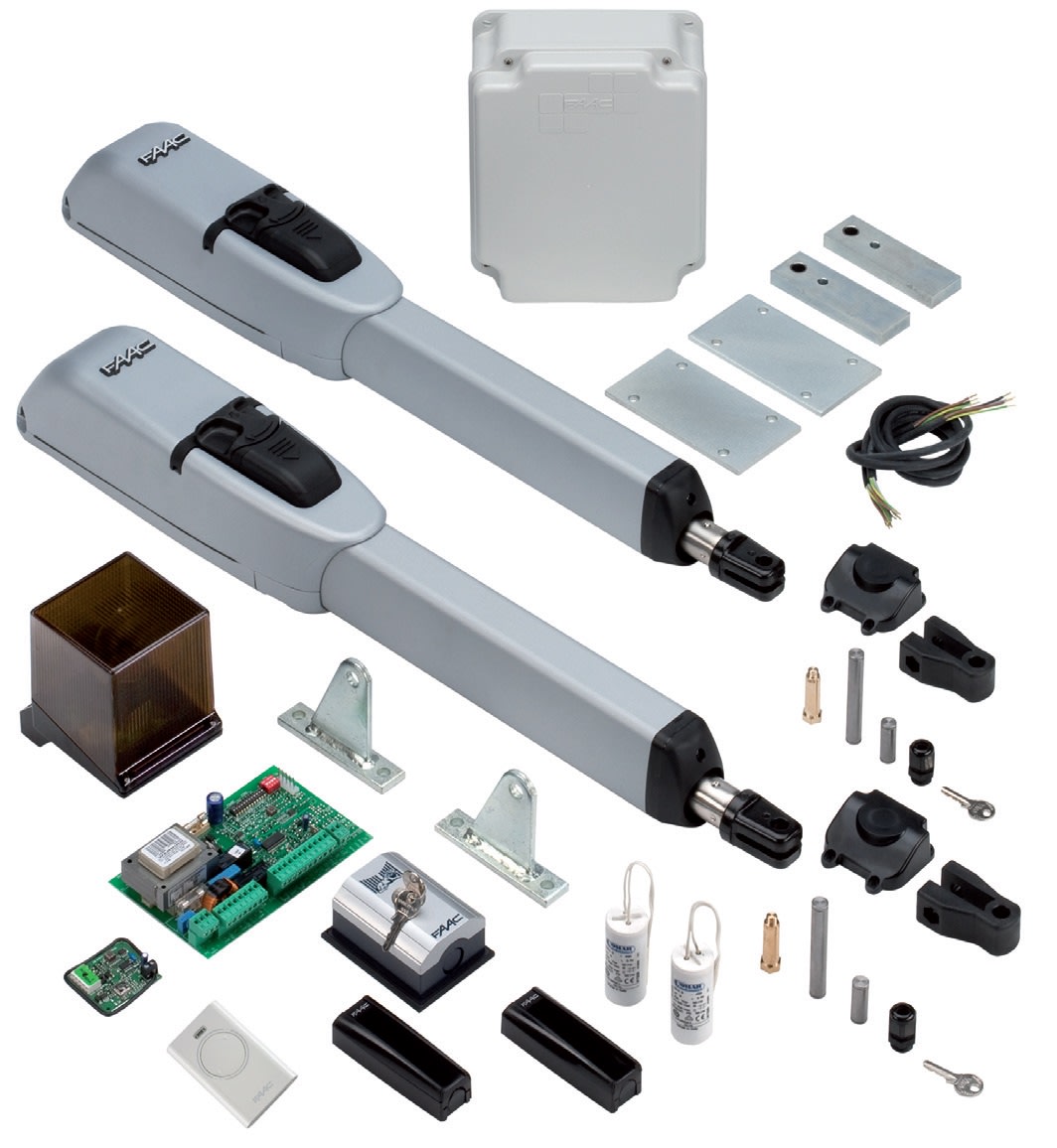 Master kit 24V SAFE: Attuatore elettromeccanico 415 24V (corsa stelo 300mm) in kit. Larghezza max singola anta: 2,5 - 4 m (con elettroserratura), vedere dettaglio modello. Frequenza d'utilizzo: Uso continuo . Il kit comprende: due attuatori elettromeccanici, accessori per l’installazione, 2 chiavi di sblocco, una scheda elettronica 24V, una ricevente 433Mhz, una trasmittente XT2 433Mhz, una coppia di fotocellule, un pulsante a chiave e un lampeggiante XLED. 415 24V è un attuatore a spinta “in asse”, disponibile in versioni con corsa stelo 300 mm (max anta 3 m) e 400 mm (max anta 4 m). L' uscita cavi orizzontale permette l’installazione vicina al suolo (installazione bassa). La gamma di accessori FAAC, inclusa nel kit, combina sapientemente tecnologia, efficienza, sicurezza e design.