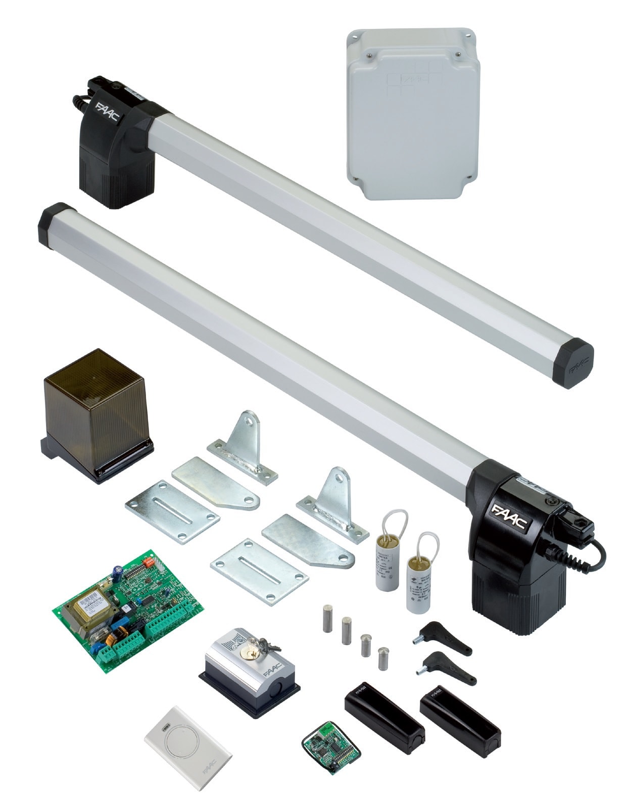 Automazione elettromeccanica in kit per ante a battente esterno ad uso residenziale. Larghezza massima singola anta: 1,8m. Frequenza di utilizzo: 18 cicli/ora. Il kit contiene due attuatori 412 elettromeccanici 230V per ante a battente, accessori per l’installazione, una chiave di sblocco, un condensatore di spunto 8µF 400V, una scheda elettronica 230V, una ricevente 433Mhz, due trasmittenti XT4 433Mhz, una coppia di fotocellule, un lettore TAG XTR B, 3 tag di prossimità e un lampeggiante XLED. L'attuatore è irreversibile, non necessita elettroserratura; l'installazione e la manutenzione sono semplici; un dispositivo di sblocco è accessibile sul lato posteriore dell'attuatore. La gamma di accessori FAAC, inclusa nel kit, combina sapientemente tecnologia, efficienza, sicurezza e design.