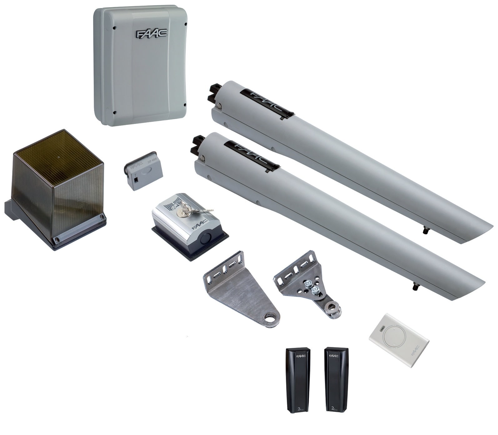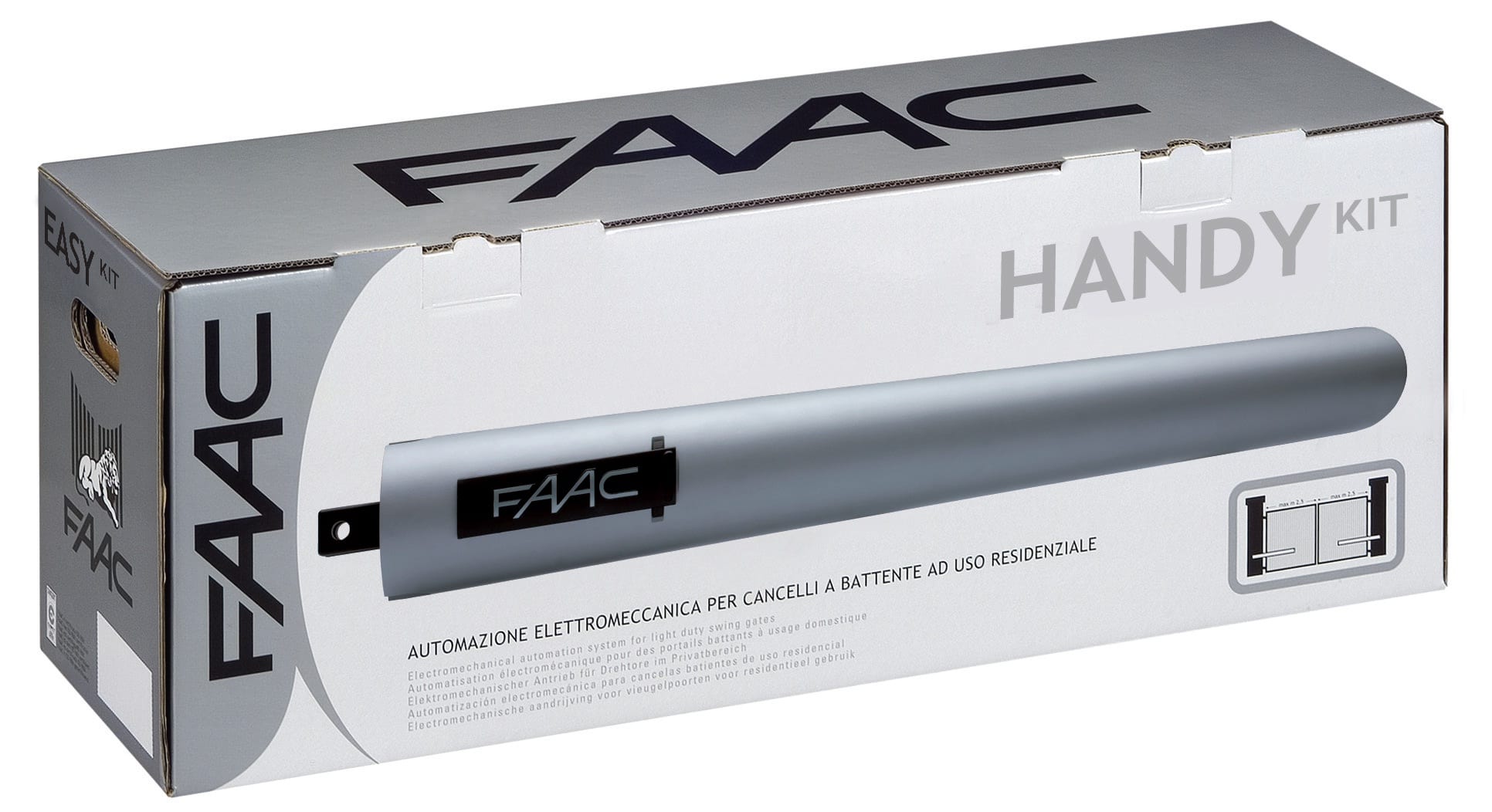 HANDY KIT SAFE: Operatore S418 elettromeccanico 24V ad utilizzo residenziale. Larghezza max singola anta: 2,3 - 2,7 m (con elettroserratura). Frequenza d'utilizzo: Uso continuo. Il kit contiene due attuatori S418 elettromeccanici 24V per ante a battente, accessori per l’installazione, due chiavi di sblocco, una scheda elettronica 24V, una ricevente 433Mhz, una trasmittente XT2 433Mhz, una coppia di fotocellule, un pulsante a chiave e un lampeggiante XLED. S418 si caratterizza per: elevata velocità di movimentazione regolabile, staffa di fissaggio “multi posizione” non a saldare, arresti meccanici in apertura e chiusura integrati (possibilità di non installare battute meccaniche). La gamma di accessori FAAC, inclusa nel kit, combina sapientemente tecnologia, efficienza, sicurezza e design.