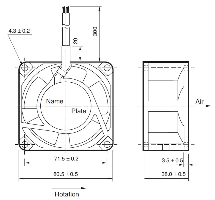 Ventilatore assiale compatto per il raffreddamento di motori in AC a poli schermati, provvisto di cuscinetti a sfera di grande durata. Connessione tramite cavo.