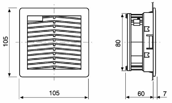 Gruppo filtro "FPF" con flusso d'aria dall'esterno verso l'interno dell'involucro. Grazie al particolare design risponde alle esigenze di compattezza e rapidità di installazione tipiche delle moderne apparecchiature. Caratterizzato da un basso profilo esterno, da un sistema di montaggio a scatto con ganci elastici e da una guarnizione di tenuta premontata che consente di ottenere una protezione alla polvere e all'acqua. Montaggio senza viti in aperture di forma quadrata come da schema di foratura; spessore della lamiera compreso tra 1,5 e 2,2 mm; eventuale fissaggio attraverso viti a testa svasata non fornite. Parti plastiche in PC/ABS, guarnizione di tenuta in schiuma poliuretanica posizionata a macchina. Panno filtro in fibre sintetiche termolegate a struttura progressiva, classe di filtrazione G3 secondo EN 779. Ventilatori su cuscinetti a sfera schermati e autolubrificati.