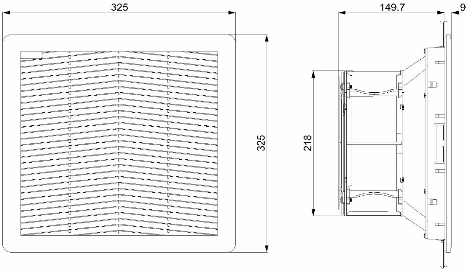 Gruppo filtro "FPF" con flusso d'aria dall'esterno verso l'interno dell'involucro. Grazie al particolare design risponde alle esigenze di compattezza e rapidità di installazione tipiche delle moderne apparecchiature. Caratterizzato da un basso profilo esterno, da un sistema di montaggio a scatto con ganci elastici e da una guarnizione di tenuta premontata che consente di ottenere una protezione alla polvere e all'acqua. Montaggio senza viti in aperture di forma quadrata come da schema di foratura; spessore della lamiera compreso tra 1,5 e 2,2 mm; eventuale fissaggio attraverso viti a testa svasata non fornite. Parti plastiche in PC/ABS, guarnizione di tenuta in schiuma poliuretanica posizionata a macchina. Panno filtro in fibre sintetiche termolegate a struttura progressiva, classe di filtrazione G3 secondo EN 779. Ventilatori su cuscinetti a sfera schermati e autolubrificati.