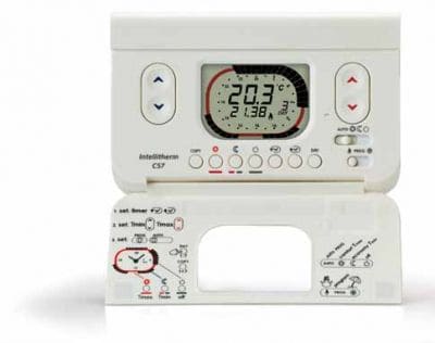 Cronotermostato elettronico a microprocessore, con programmazione settimanale per il comando di impianti di riscaldamento e di condizionamento. Portata contatti 5(3)A 250V~.Microdisconnessione (1BU).Contatto in commutazione libero da tensione.Alimentazione con 2 pile a stilo tipo AA da 1,5V alcaline lunga durata senza connessioni alla linea elettrica.E' fornito con uno zoccolo adatto per il montaggio su scatole da incasso a 3 moduli o a parete.Collegamento all'utilizzatore con 2 fili.Montare il cronotermostato a 1,5 metri di altezza dal pavimento, lontano da cucine, finestre, porte e fonti di calore in generale.Due pulsanti colorati, uno rosso e l'altro blu per la regolazione delle temperature di COMFORT e di ECONOMY.Un cursore per la scelta del modo di funzionamento: AUTO, COMFORT, ECONOMY, ANTIGELO.Un cursore per la scelta del tipo di funzionamento: ESTATE-INVERNO, con lo stesso cursore si può accedere alla programmazione.Due tasti per la regolazione dell'ora in corso.Tre tasti per la scelta del periodo di COMFORT, di ECONOMY e ANTIGELO.Un tasto per copiare la programmazione al giorno successivo.Un tasto per passare al giorno successivo senza copiare la programmazione.Un tasto di RESET per ripristinare il programma preimpostato.Un dip switch per selezionare il modo ANTIGELO 5°C oppure SPENTO (ON a 0°C)