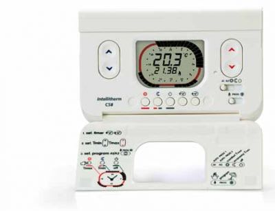Cronotermostato elettronico a microprocessore, con programmazione giornaliera per il comando di impianti di riscaldamento e di condizionamento.Portata contatti 5(3)A 250V~.Microdisconnessione (1BU). Contatto in commutazione libero da tensione. Alimentazione con 2 pile a stilo tipo AA da 1,5V alcaline lunga durata senza connessioni alla linea elettrica.Intellitherm C58 viene fornito con uno zoccolo adatto per il montaggio su scatole da incasso a 3 moduli, tonde o per montaggio a parete, la sporgenza dell'apparecchio è minima e l'ambientazione ancora più facilitata.Collegamento all'utilizzatore con 2 fili.Tre tasti per la scelta del periodo di COMFORT, di ECONOMY e ANTIGELO.Un tasto di RESET per ripristinare il programma preimpostato.Un dip switch per selezionare il modo ANTIGELO 5°C oppure SPENTO (ON a 0°C).Possibilità di visualizzazione dei dati statistici dell'impianto: ore di funzionamento del giorno precedente e dall'inizio del funzionamento dell'apparecchio, temperatura minima e massima del giorno precedente e l'ora in cui viene misurata.Possibilità di sapere per quante ore è stato "richiesto calore" (relè chiuso - ON) il giorno precedente e dall'inserimento delle pile o da un reset dell'apparecchio.Programmazione personalizzata senza limiti di intervento, anche uno ogni mezz'ora.Tre temperature, programmabili quella di COMFORT e di ECONOMY, fissa quella ANTIGELO (preregolata a 5°C).Funzione JOLLY per escludere temporaneamente il programma automatico, senza modificarlo, e ottenere continuamente da 1 a 240 ore sempre la temperatura desiderata (comfort, economia, spento).