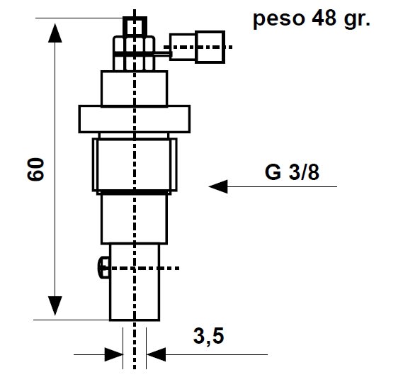Sonda portaelettrodo in acciaio inox AISI 303, adatta per pozzi e serbatoi sotto pressione e/o ad alte temperature. • Pressione massima di funzionamento 10 bar • Temperatura massima 160 °C • Attacco G 3/8” maschio • Peso 48 gr. INSTALLAZIONE: Collegamento tra sonda e livellostato tramite cavo flessibile unipolare (non fornito). Corredare la sonda di elettrodo (non fornito).