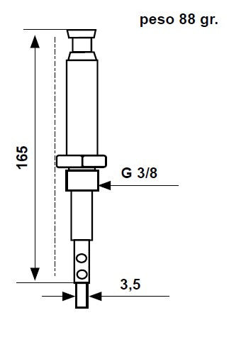 Sonda portaelettrodo in acciaio inox AISI 303 Adatta per pozzi e serbatoi sotto pressione e/o ad alte temperature.Pressione massima di funzionamento 35 bar. Temperatura massima 250°C. Attacco G 3/8” maschio. Peso 88 gr.