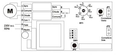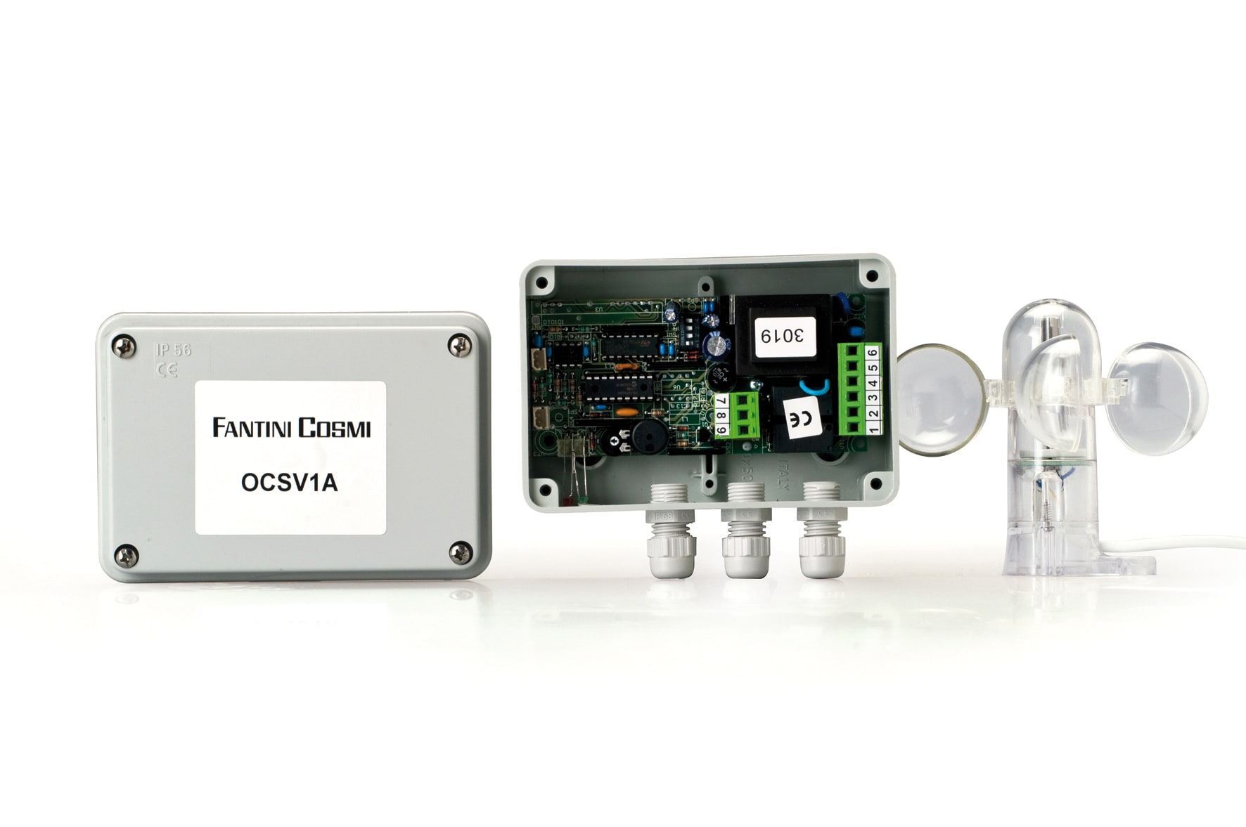 La centrale OCSV1A serve per comandare un motore elettromeccanico per tende da sole con integrata la funzione per il controllo del sole e la protezione in caso di vento eccessivo •Alimentazione 230Vac 50Hz •Portata massima relè 250Vac 4A •Rispondenza alle norme EN60335-1 •Range regolazione vento 5 ÷ 40 Km/h •Range intervento sole 0 ÷ 50 lux •Temperatura funzionamento -10 ÷ 60°C •Contenitore materiale ABS •Dimensioni del contenitore120x80x50