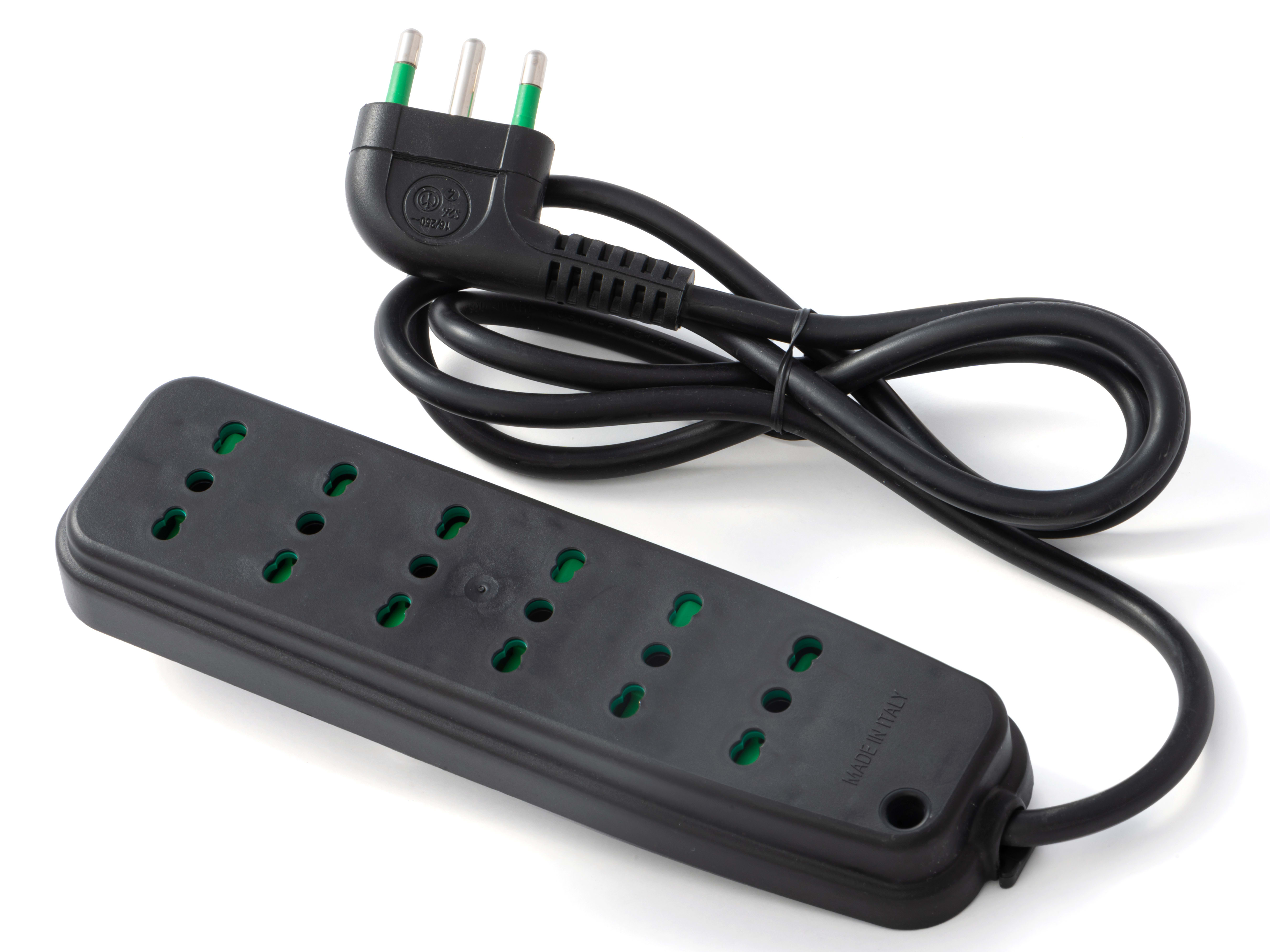 Multipresa OMEGA 6 prese bipasso italiane 2P+T 16A cavo 1,5 m. 3G1 H05VV-F spina a squadra italiana 2P+T 16A, colore nero