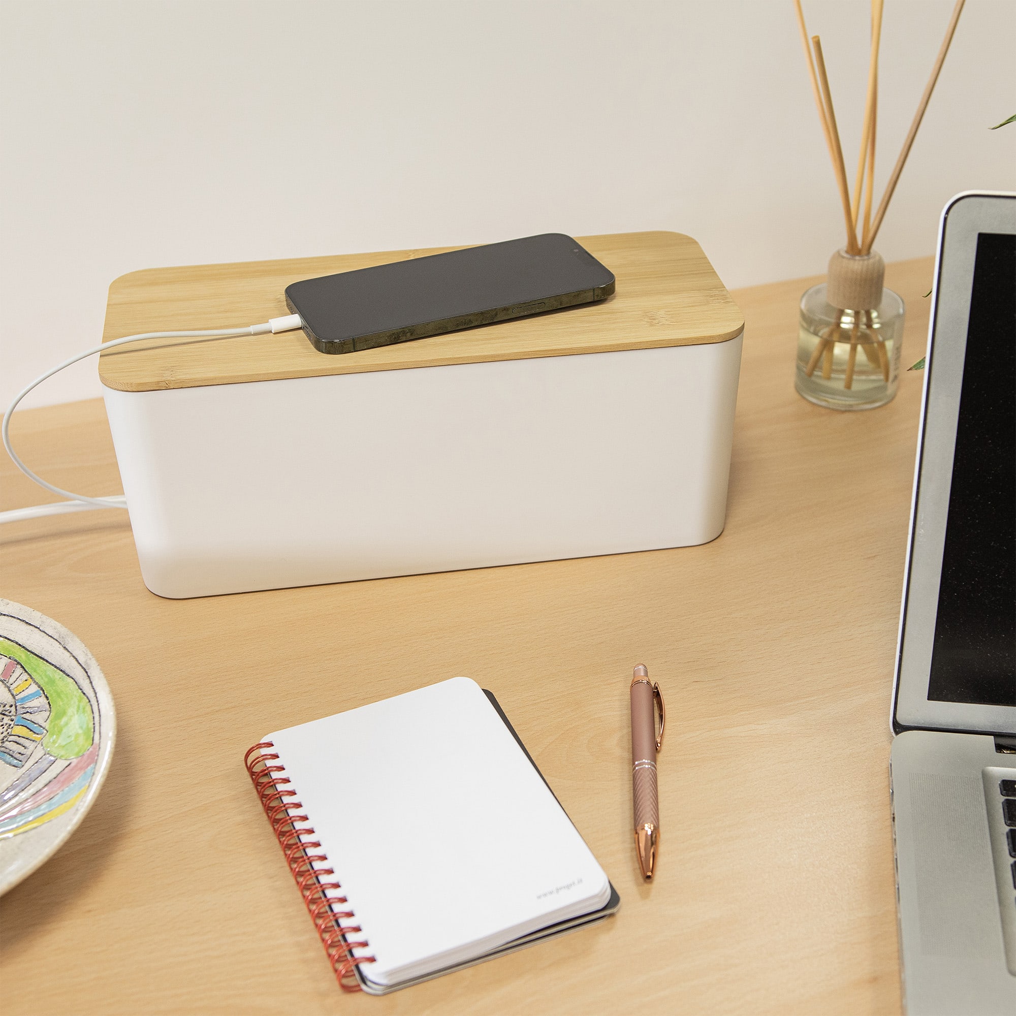 Box da tavolo per multiprese 3/4 posti\ndimensioni 320x135x127 mm. (LxPxA)\ncorpo in plastica\ncoperchio in legno, colore bianco