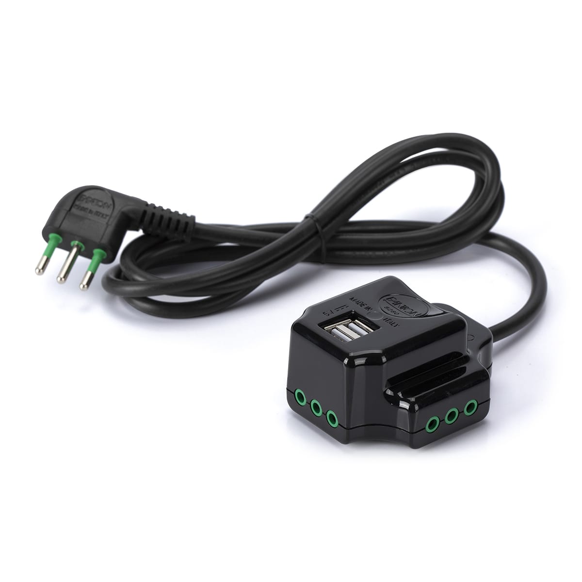 Multipresa 3 prese italiane 2P+T 10A 2 prese USB-A 5V 3A cavo 1,5 m. 3G0,75 H05VV-F spina a squadra italiana 2P+T 10A, colore nero