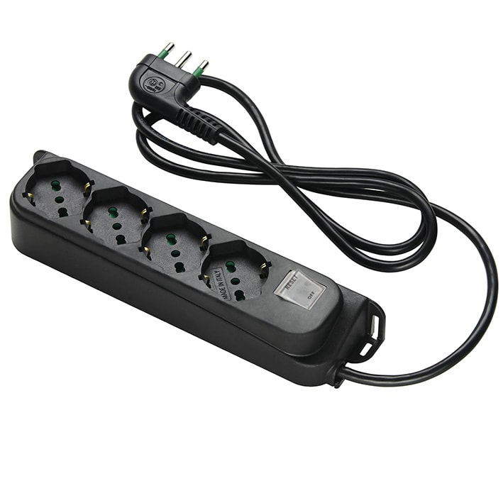 Multipresa OMEGA 4 prese bipasso italo/tedesche 2P+T 16A cavo 1,5 m. 3G0,75 H05VV-F spina a squadra italiana 2P+T 10A + interruttore automatico luminoso di sovraccarico, colore nero