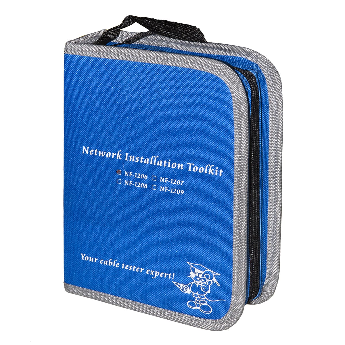 Kit attrezzi per crimpaggio reti LAN contenente: Pinza per connettori RJ11/RJ12/RJ45 Spelafili a 3 lame per cavi tondi e piatti Tester per cavi RJ12/RJ45 con 8 led + terra Inseritore KEYSTONE con punta in metallo Scatola a 5 scomparti per minuterie con: - 15 plug RJ12 - 15 plug RJ45 - 1 adattatore RJ45, colore blu