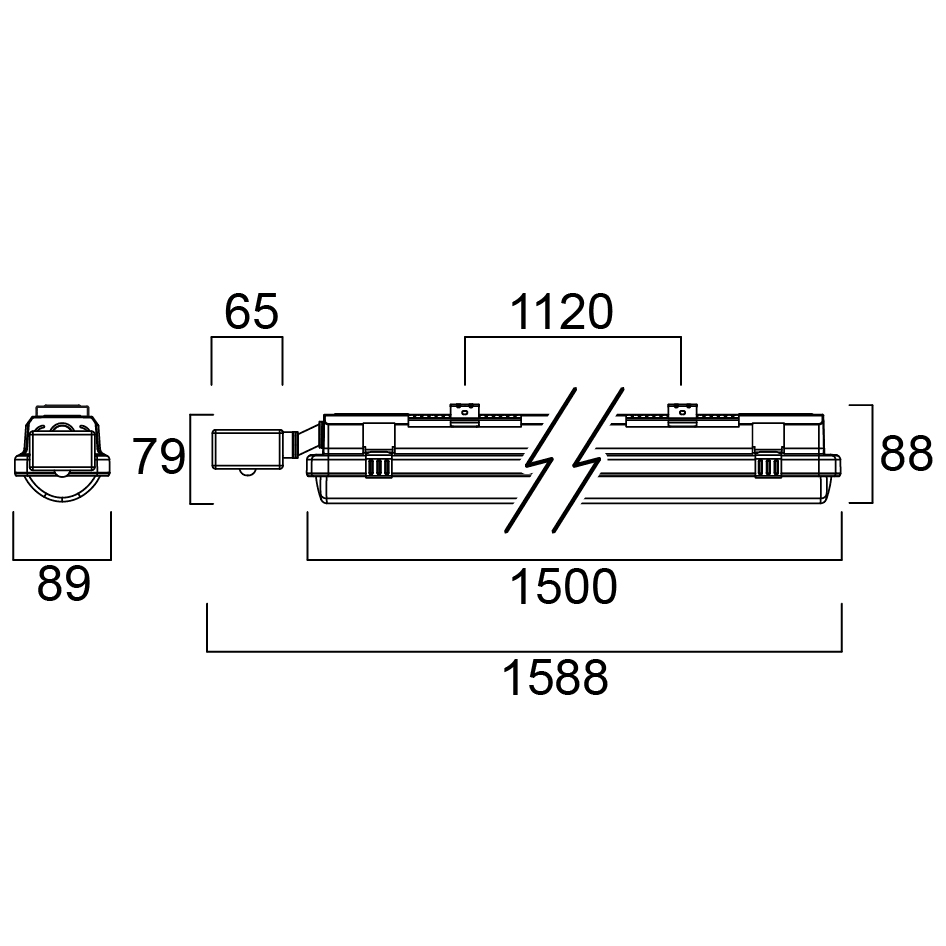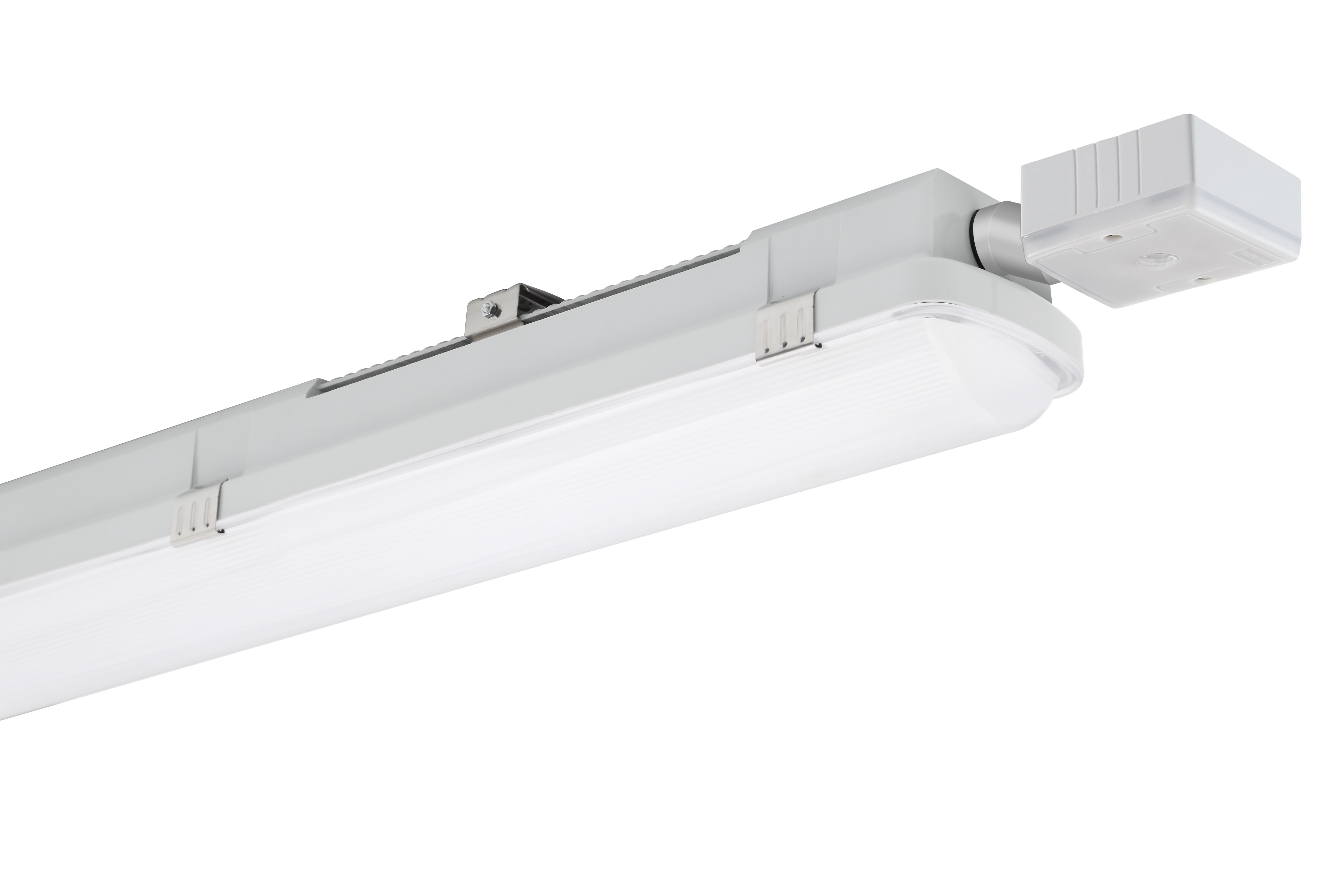 Resisto, integrated LED weatherproof luminaire, with UV stabilized flat diffuser designed to achieve uniform lit appearance, optimise light output and to reduce glare. 301 stainless steel diffuser clips and fixing brackets for surface mounting. Polycarbonate housing and diffuser - no yellow discolouration over time. 7600lm; 55W; 138lm/W; 4000K; SDCM<5; CRI80; IP66; IK08 (sensor IK03); Class I; 69,000hrs (L80B20) lifespan; 1588mm x 87mm x 80mm; D-mark; SylSmart Connected Building enabled.