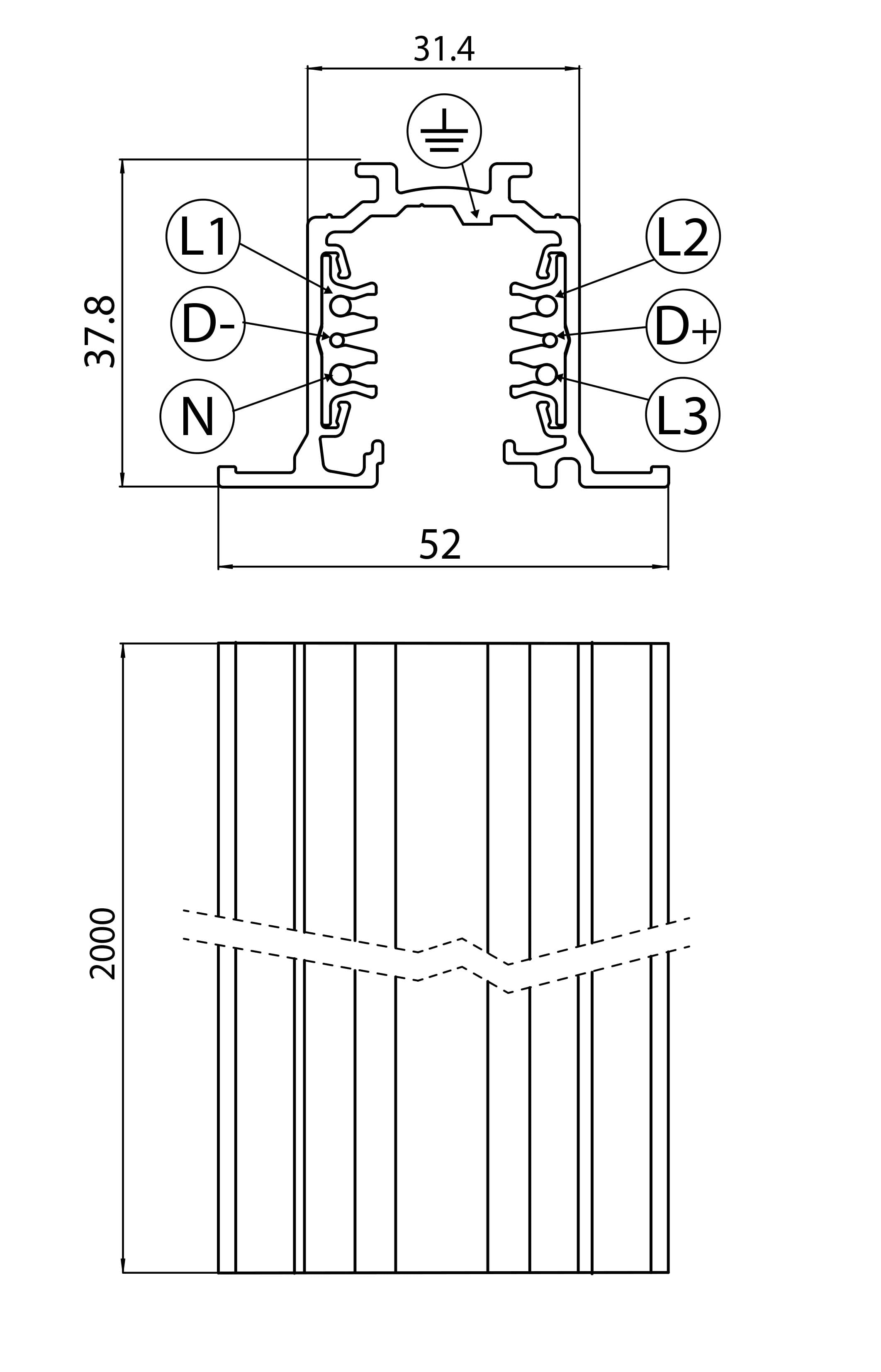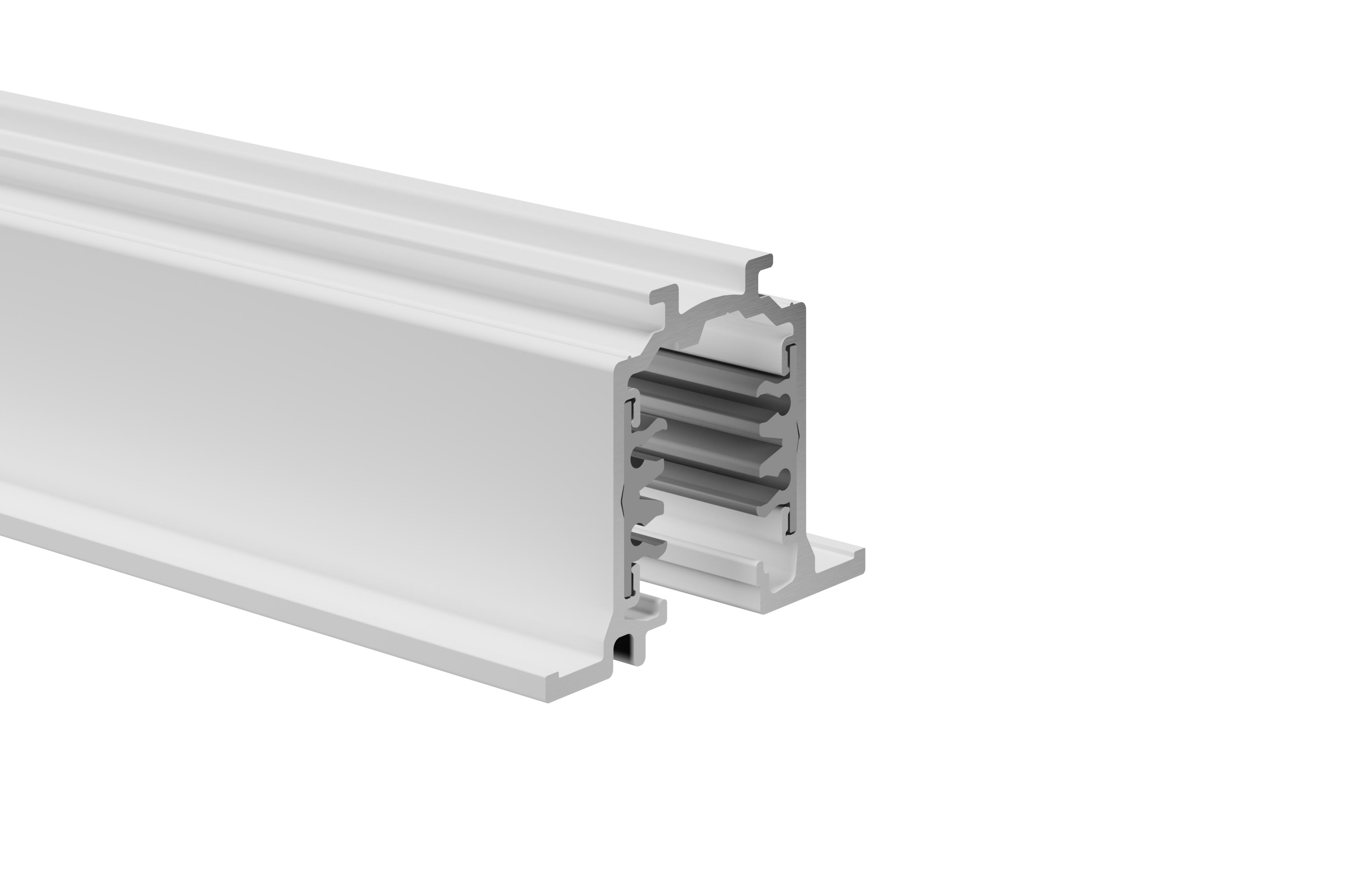 OneTrack Recessed - 3 circuit track + 2 circuit control L1/L2/L3/Neutral/ground 16A/440V + D+/D- 2x1A/50V FELV AC, DALI, DMX, 1-10V etc. compatible, circuits can be controlled individually, aluminum body, suitable for recessed mounting, 2000 x 30.7 x37.8 mm (L x W x H), white (RAL 9010). Singular carton tube packaging.