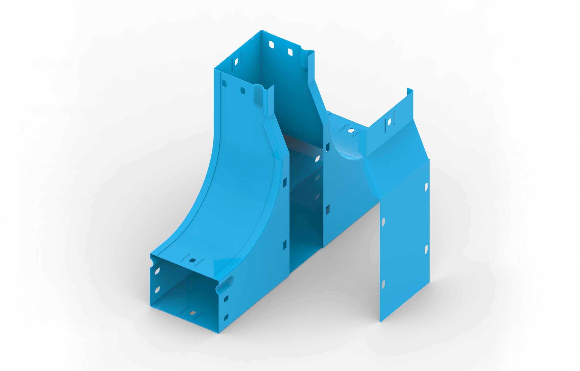 Articolo della serie FEMI3 costituito da derivazione T alto var. piano, in acciaio al carbonio zincato sendzimir con trattamento di protezione superficiale tramite verniciatura a polvere epossipoliestere a circa 180 °C. Colorazione standard blu RAL 5012,disponibili altri colori a richiesta. Si raccomanda per installazioni interne.
