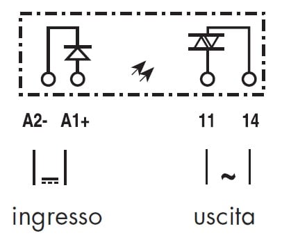 Relè a stato solido. N°contatti: 1 NO numero di fasi: 1 adatto per installazione in serie: si Volt DC: 24 V. tensione d'esercizio: da 12 a 275 V. corrente d'esercizio nominale Ie per AC-1: 2 A. Alimentazione: DC commutazione a punto neutro: si Categoria di protezione: RT III Accessori: Zoccolo S.93