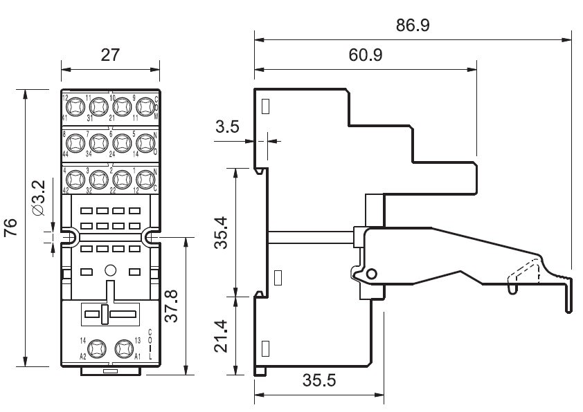 Zoccolo con morsetti a bussola Montaggio: barra cieca 35 mm (A): 10 Grado di protezione: IP 20 Accessori: Ponticello metallico o plastico;pettine 6 poli;moduli temporizzatori;moduli di segnalazione e protezione EMC