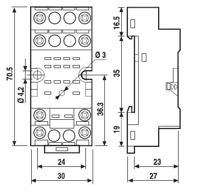 Zoccolo con morsetti a piastrina Montaggio: barra cieca 35 mm (A): 10 Colore: Nero Grado di protezione: IP 20 Accessori: Ponticello metallico;moduli di segnalazione e protezione EMC