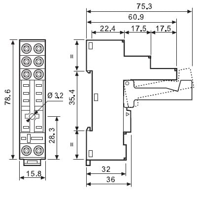 Zoccolo con morsetti a bussola Montaggio: barra cieca 35 mm (A): 10 Grado di protezione: IP 20 Accessori: Moduli di segnalazione e protezione EMC;pettine 8 poli;moduli temporizzatori;ponticello plastico
