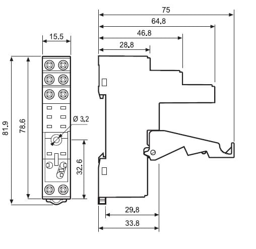 Zoccolo con morsetti a bussola Montaggio: barra cieca 35 mm (A): 10 Grado di protezione: IP 20 Accessori: Moduli di segnalazione e protezione EMC;pettine 8 poli;ponticello plastico
