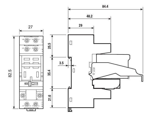 Zoccolo con morsetti a bussola Montaggio: barra cieca 35 mm (A): 12 Grado di protezione: IP20 Accessori: Ponticello plastico o metallico;pettine 6 poli;moduli di segnalazione e protezione EMC;moduli temporizzatori