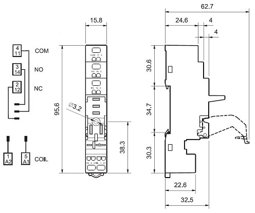 Zoccolo con morsetti a molla Montaggio: barra cieca 35 mm (A): 10 Grado di protezione: IP 20 Accessori: Ponticello plastico o metallico;moduli di segnalazione e protezione EMC;moduli temporizzatori