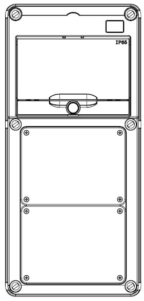 Quadro stagno Q-DIN 10 moduli vuoto in plastica grigio RAL 7035 IP65. • Numero di IEC 309/IB alloggiabili: 2 IB Orizzontali 16/32 A SBF IP44 sovrapposte • Numero di coperchi ciechi in dotazione: 1 IB 16/32 A