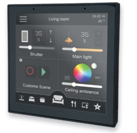 Piccolo is a multitasking device that is particularly dedicated for in-room management of different scenarios such as residential buildings or hotels. It acts as a client of either Pro line or Trend line devices.The 4” screen, the embedded temperature and humidity sensors allow it to be used as thermostat, for the management and setting of temperature in each room.It is also possible to launch sceneries of set thermal comfort modality to grant the right temperature at the right time.